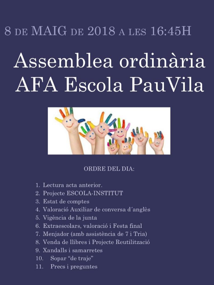 El proper dimarts, 8 de maig de 2018 a les 16:45 hores, farem l’Assemblea de l’AFA Pau Vila.