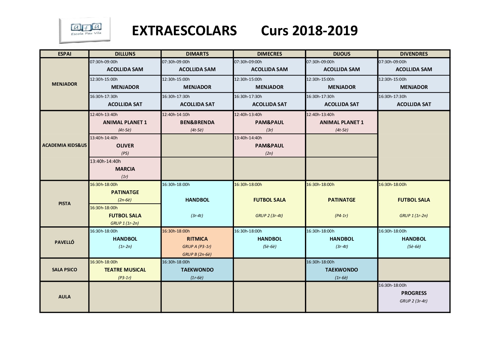 Un cop fet el recompte d’inscripcions que hem rebut durant totes aquestes setmanes i fins ahir, confirmem la graella definitiva amb les activitats extraescolars que és duran a terme a l’escola aquest curs 2018-2019.
