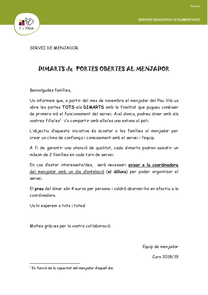 TORNEN ELS DIMARTS DE PORTES OBERTES AL MENJADOR!!