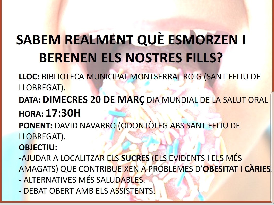 L’odontòleg EAP, David Navarro, donarà una conferència a la Biblioteca Montserrat Roig, a les 17:30 hores amb el títol: Sabem realment què esmorzen i berenen els nostres fills?.