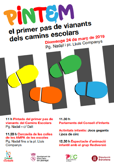 Aquest diumenge 24 de març, a les 11:00 hores es farà la pintada del primer pas de vianats dels Camins Escolars. El Consell d’Infants de Sant Feliu de Llobregat ens convida a tots a participar. No t’ho perdis!